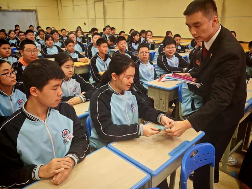 “或许有同学会觉得,宪法是印在纸上的条文,离我们的日常生活很遥远。但事实恰恰相反,宪法作为国家的根本法、治国安邦的总章程,早已融入我们人生的每一个阶段,时刻守护着我们的权益。”课堂上,法官刘赫褪去法袍化身为亲切的 “法治讲师”,以宪法基本内容为开篇,巧妙以 “宪法与我们的一生”为切入点,用通俗易懂的语言解读公民的基本权利与义务。从出生时享有的人格权,到接受义务教育的权利与义务,再到成年后参与社会事务的权利,刘赫法官通过贴近青少年生活的场景举例,让同学们清晰认识到:宪法不是抽象的概念,而是贯穿人生始终、默默守护成长的 “权利保障书”。